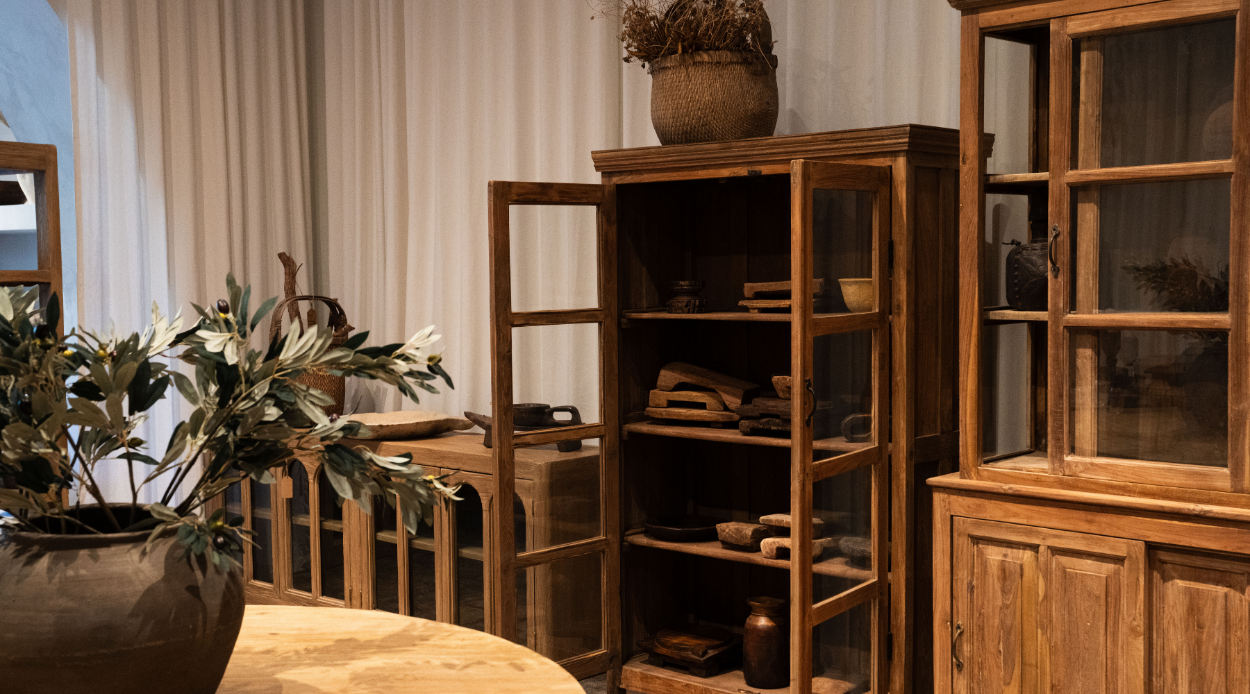 These pieces carry weight, built to last, textured by time, and chosen for their quiet strength. Featuring vintage teak and rosewood cabinetry with softened edges, arched lines, and presence.